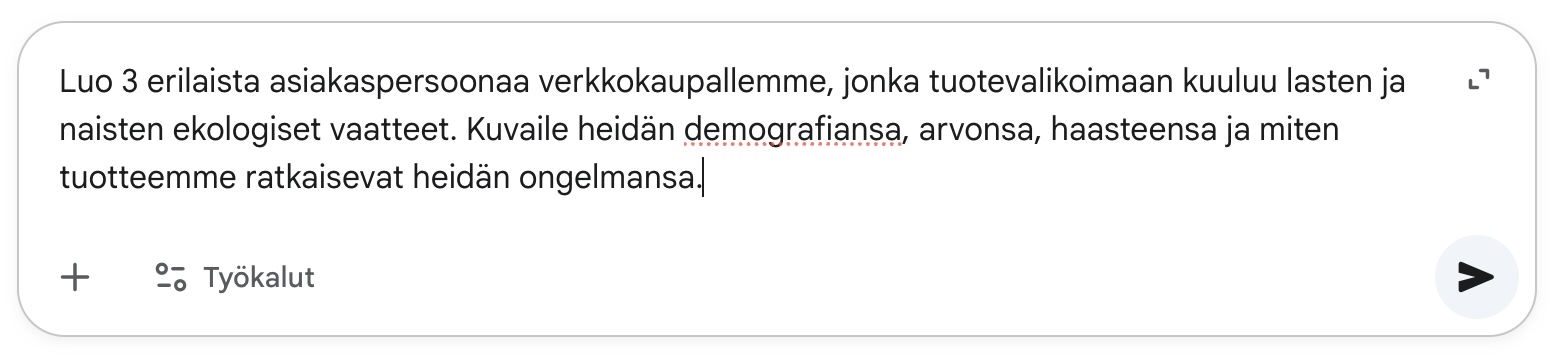Gemini voi auttaa sinua luomaan myös yksityiskohtaisia asiakaspersoonia, joiden avulla voit kohdentaa verkkokaupan ja esimerkiksi mainonnan sisällöt paremmin. Voit pyytää Geminiä laatimaan sisältöjä spesifisti esimerkiksi nuorelle opiskelijalle tai kokeneelle ammattilaiselle sopivalla äänensävyllä.