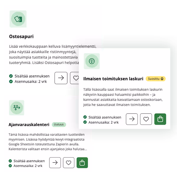 Löydä suosituimmat lisäosat, jotka parantavat kauppasi käyttökokemusta ja tukevat myyntiäsi. Kaikki tarjolla olevat ominaisuudet ovat täydellisesti yhteensopivia uuden MyCashflow-oletusteeman kanssa.